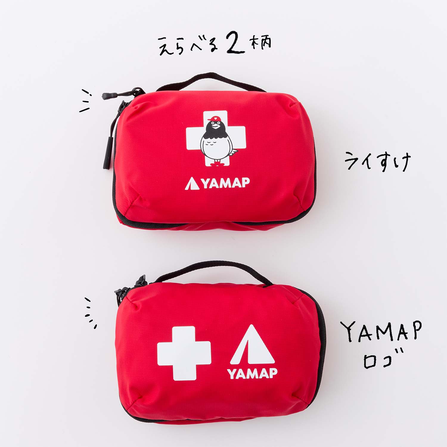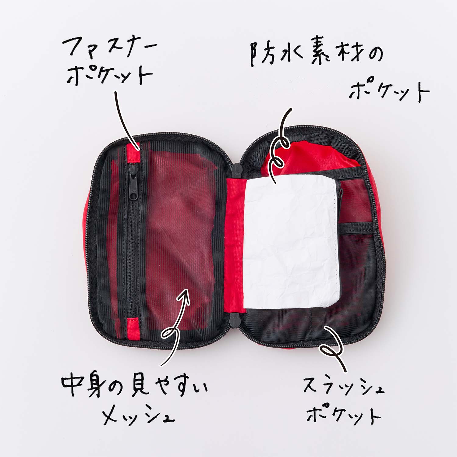 本体は、いざという時に素早く取り出せる視認性の高いレッドカラー。本のように180°開くラウンドファスナーデザインで、必要な救急用品を効率よく収納できるようファスナーポケット、スラッシュポケット、防水素材のポケットと3種類を設置しました。ほかにも持ち運びに便利な持ち手や、ホイッスルを兼ねたファスナースライダーなど、いざという時に使えるアイデアが満載の自信作です。