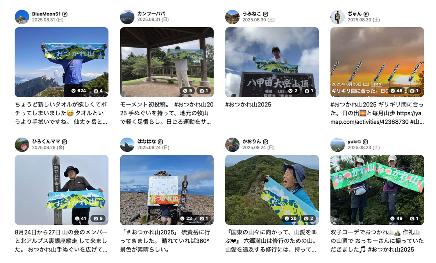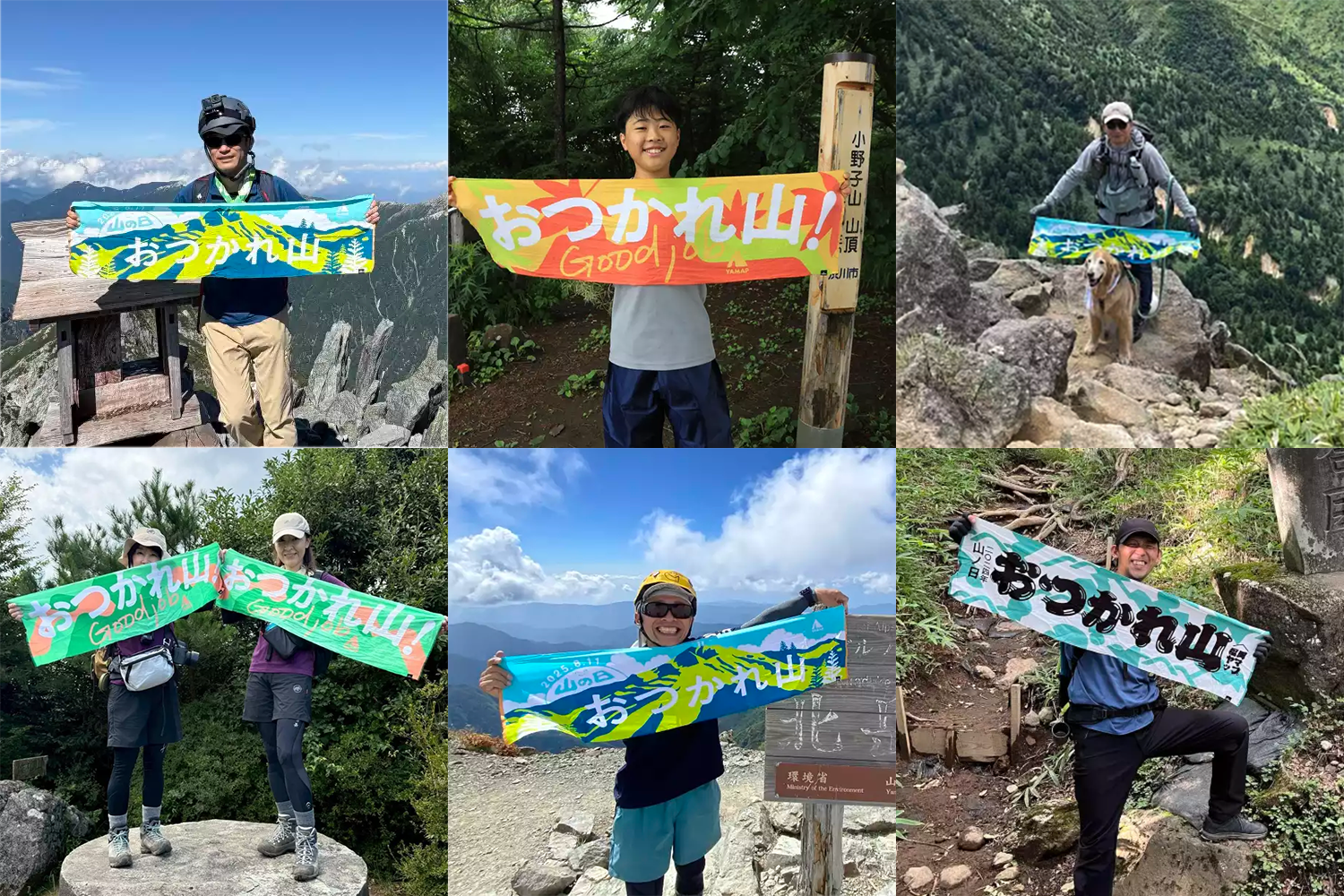 どの写真からも伝わってくるのは、登頂を「おつかれ山てぬぐい」と一緒に楽しむ笑顔と達成感。