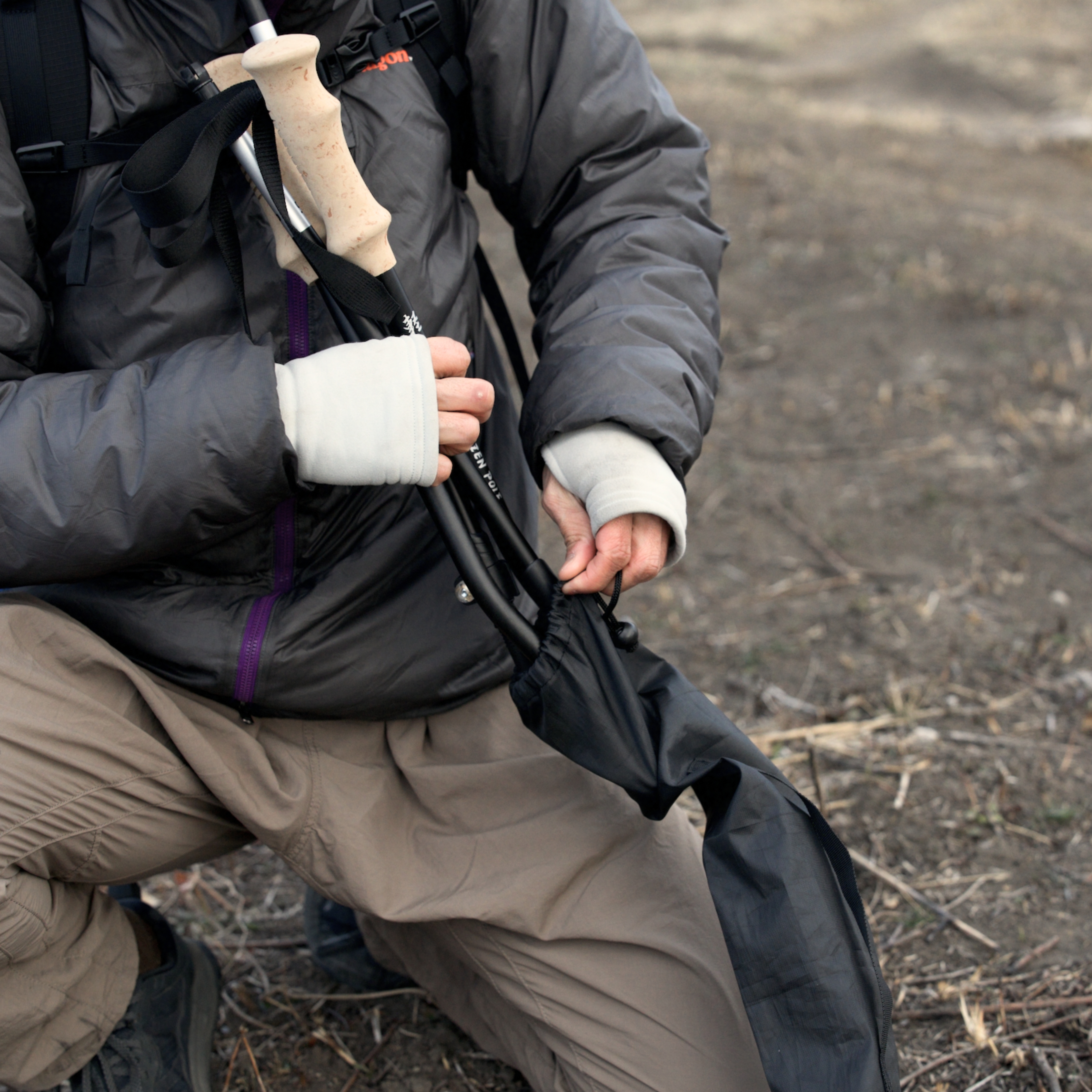岩場や鎖場、梯子など手を使って体を支える必要がある場所では本製品を使用せず、ザックに収納するなどしてください。