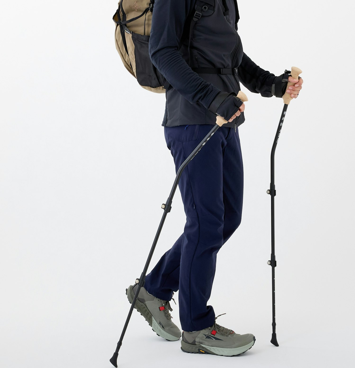 軽禅杖は特許技術を生かした「くの字」形状により、大きく腕を前に出すことなく、足の一歩先にポールの先端が着地し、ポールの接地面が体に近い場所に長く位置することで、一般的なトレッキングポールと比較して、腕の負担抑え、少ない力で推進力を得ることが可能です。