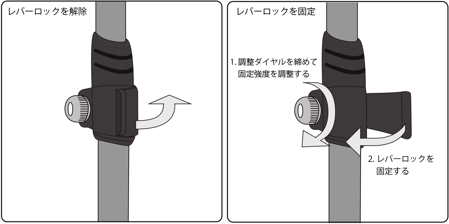 2.レバーロックを固定する際は、調整ダイヤルで固定強度を調整してから固定してください。レバーロックを固定した後では、ダイヤルで正しく調整することができません。