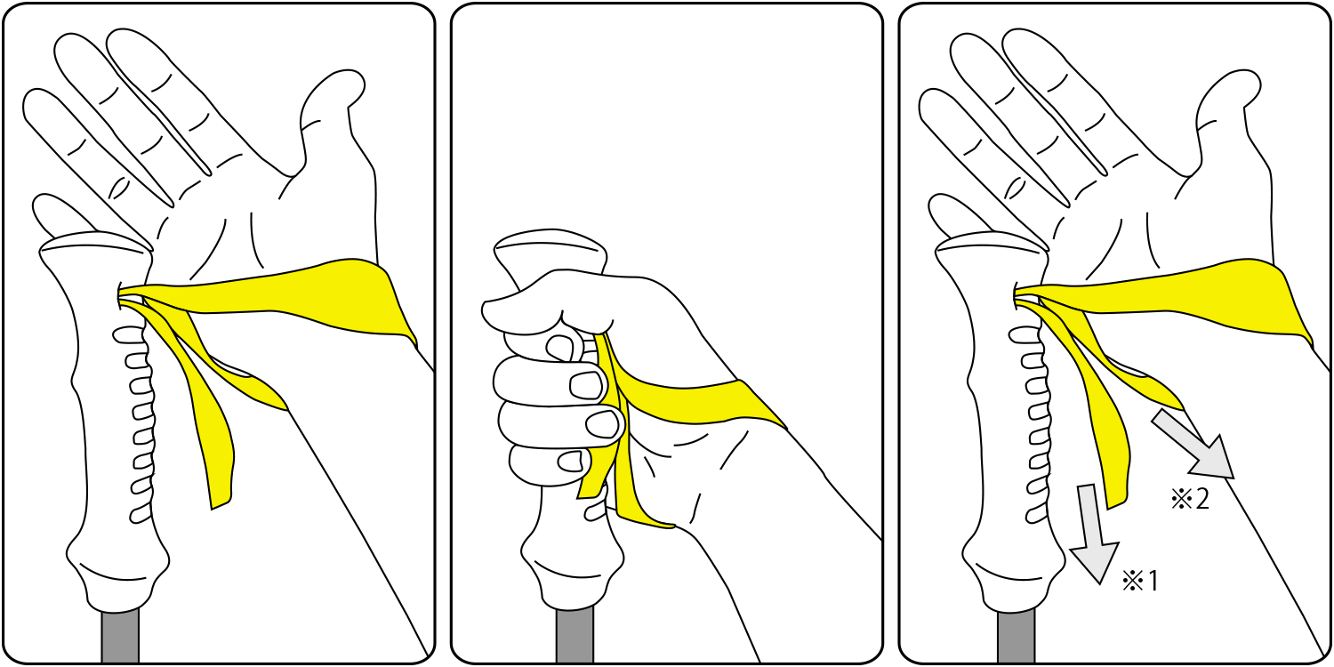 2.手を通したら、ストラップごとグリップを握り込んでください。ストラップごと握り込むことで、手の負担を抑えることができます。