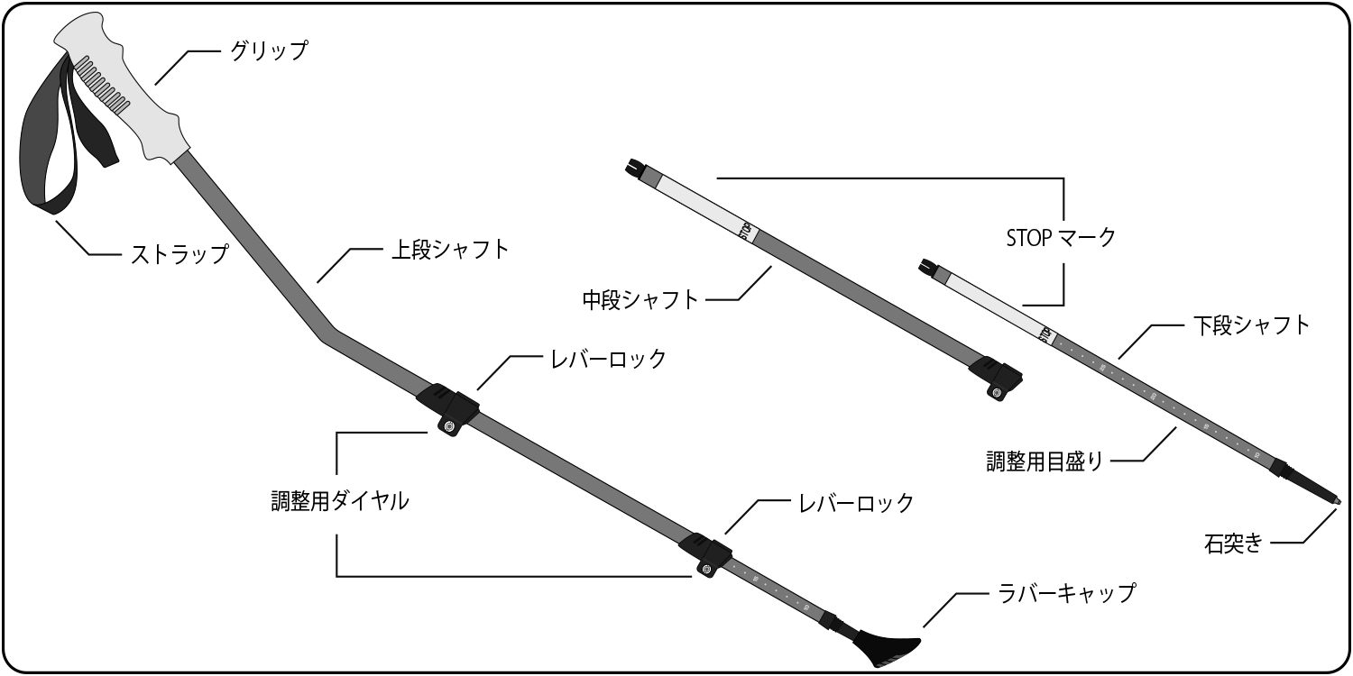 本製品は登山・ハイキング用です。高齢者の歩行補助や松葉杖などの医療器具としては絶対に使用しないでください。転倒などの重大な事故につながる恐れがあります。